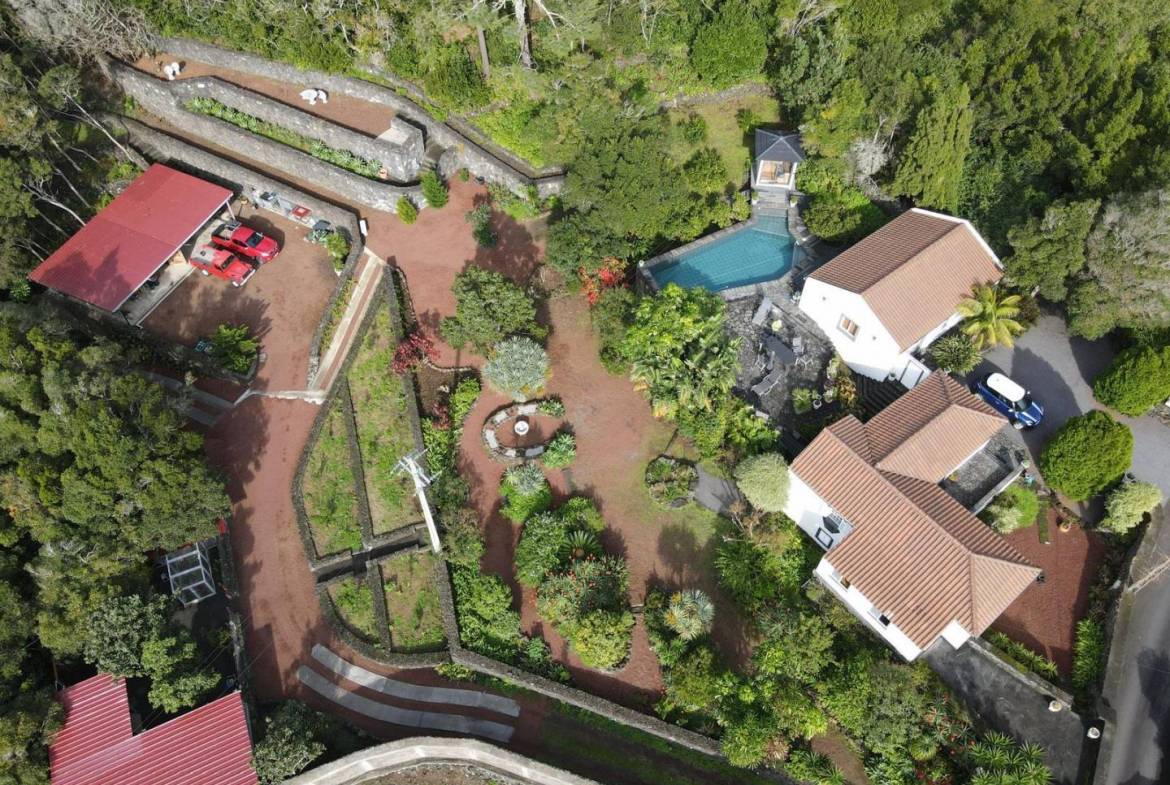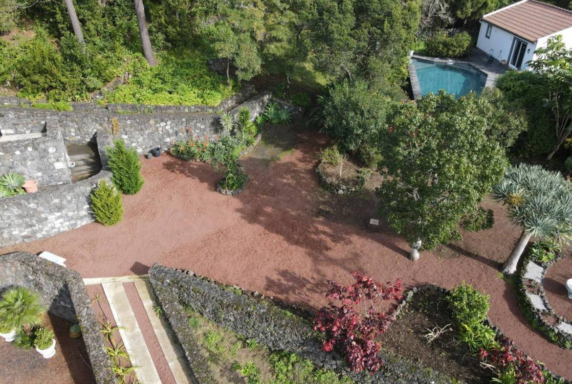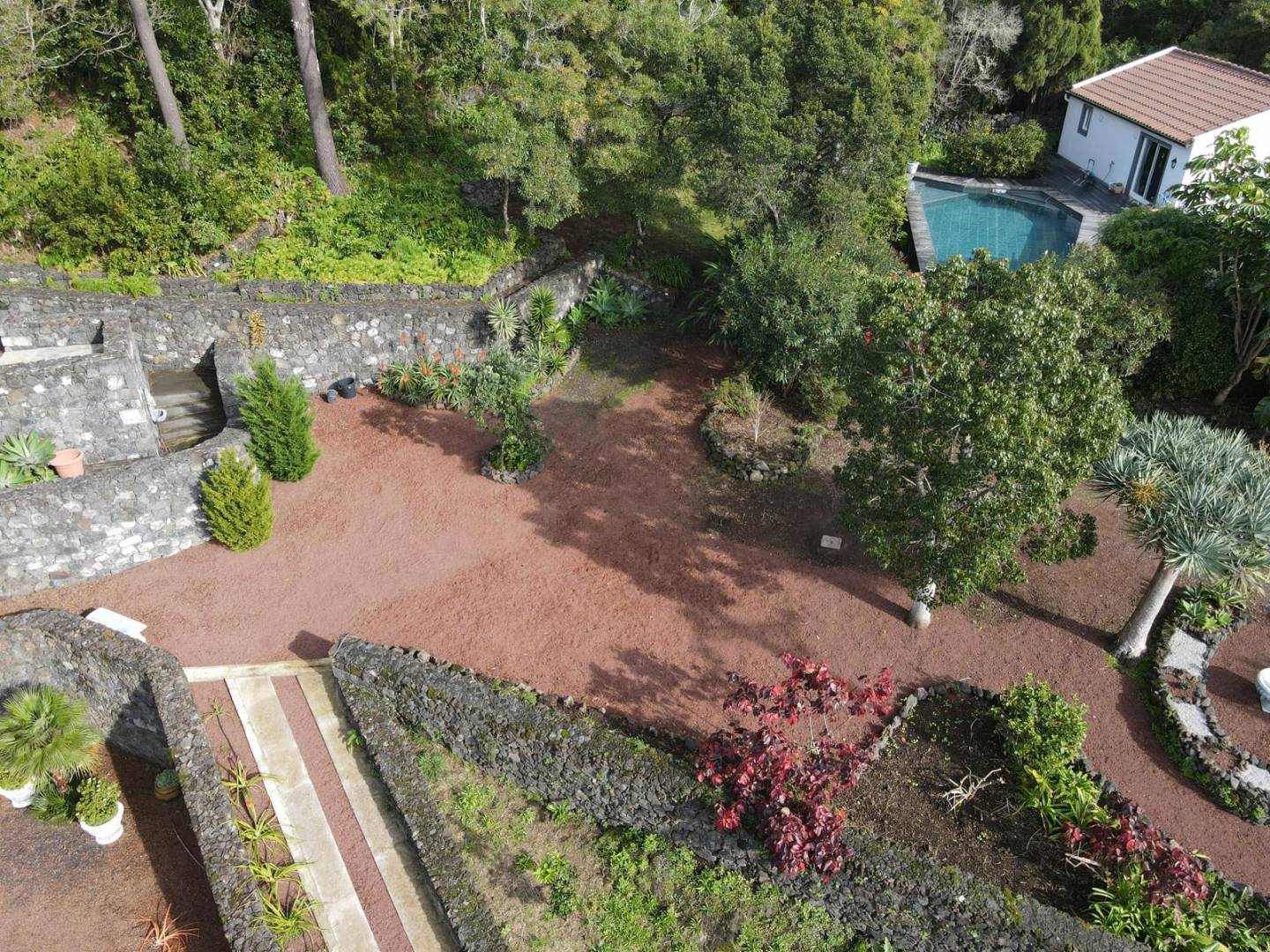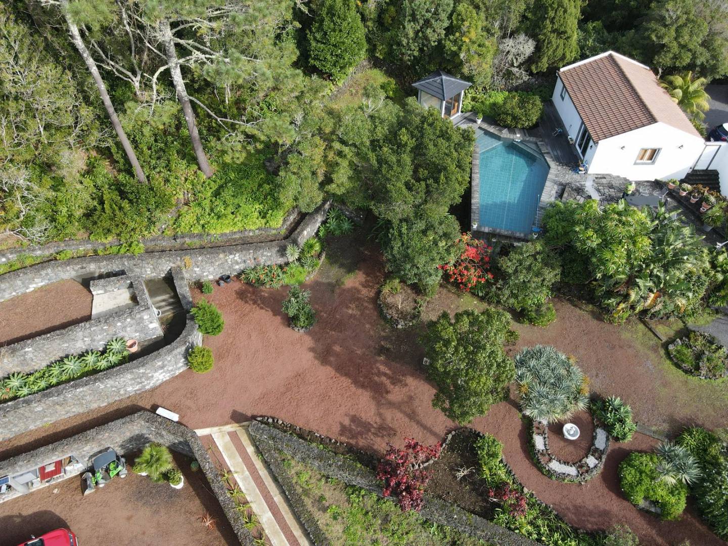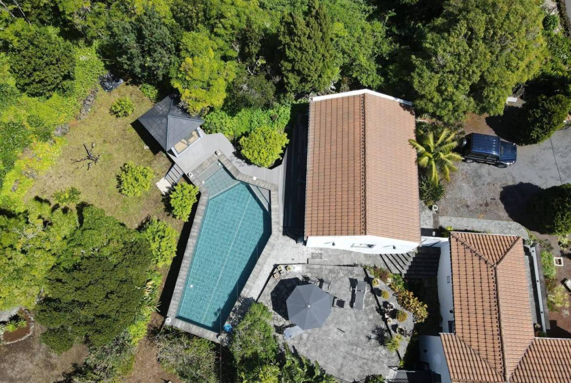 The exterior of the property is a masterclass in landscaping, utilizing the local volcanic “terra rossa” to create a striking contrast against the vibrant greenery.