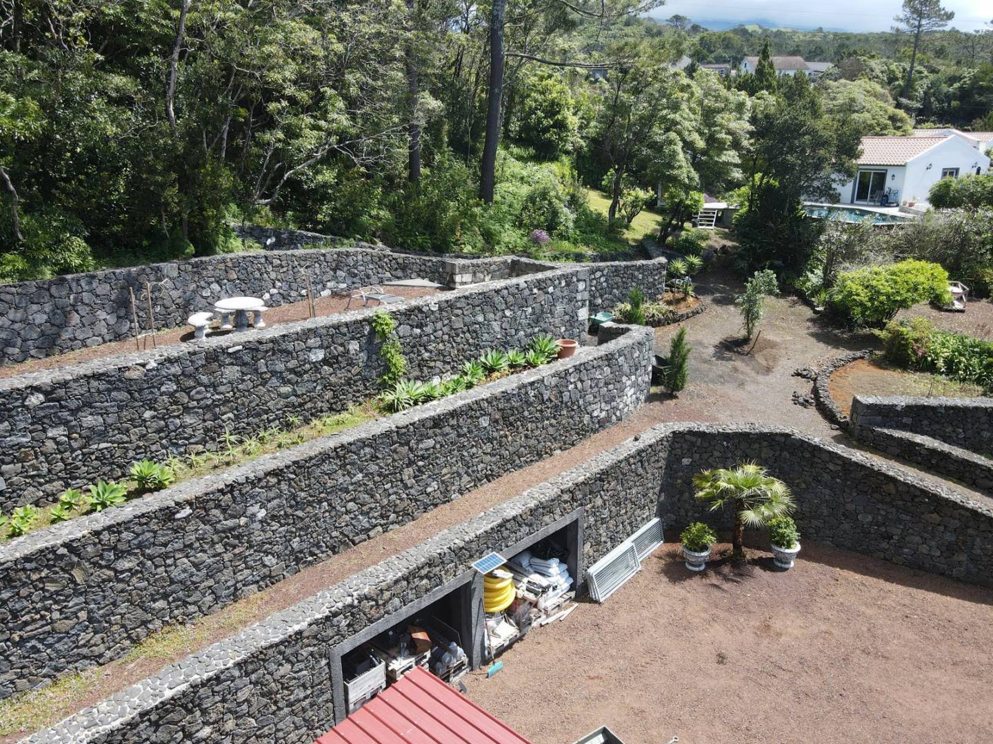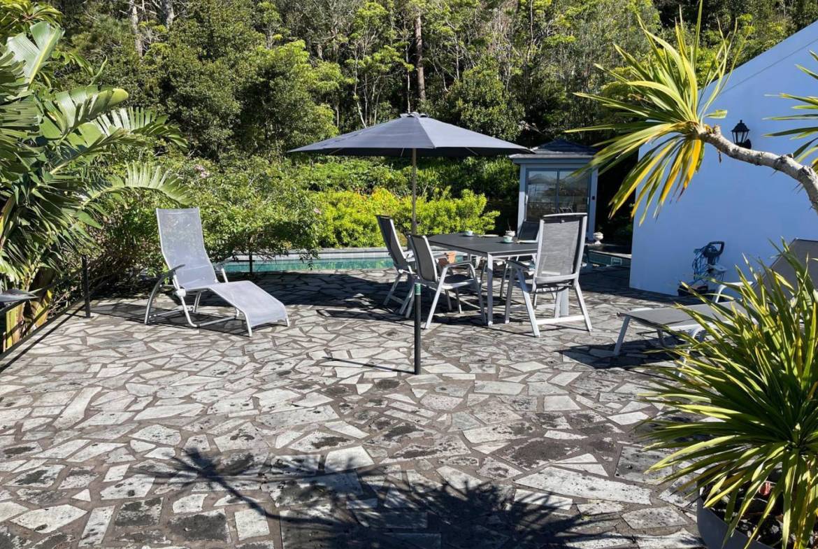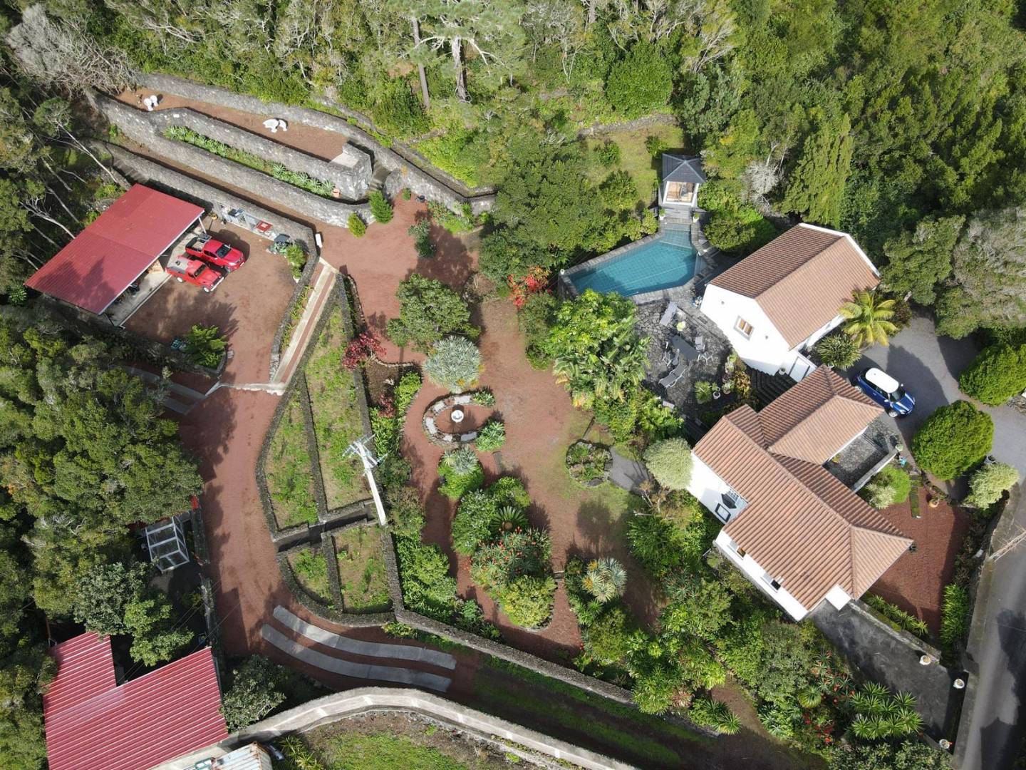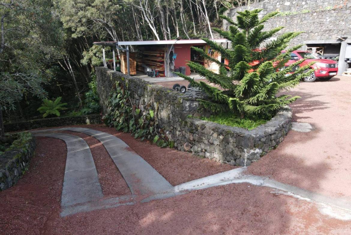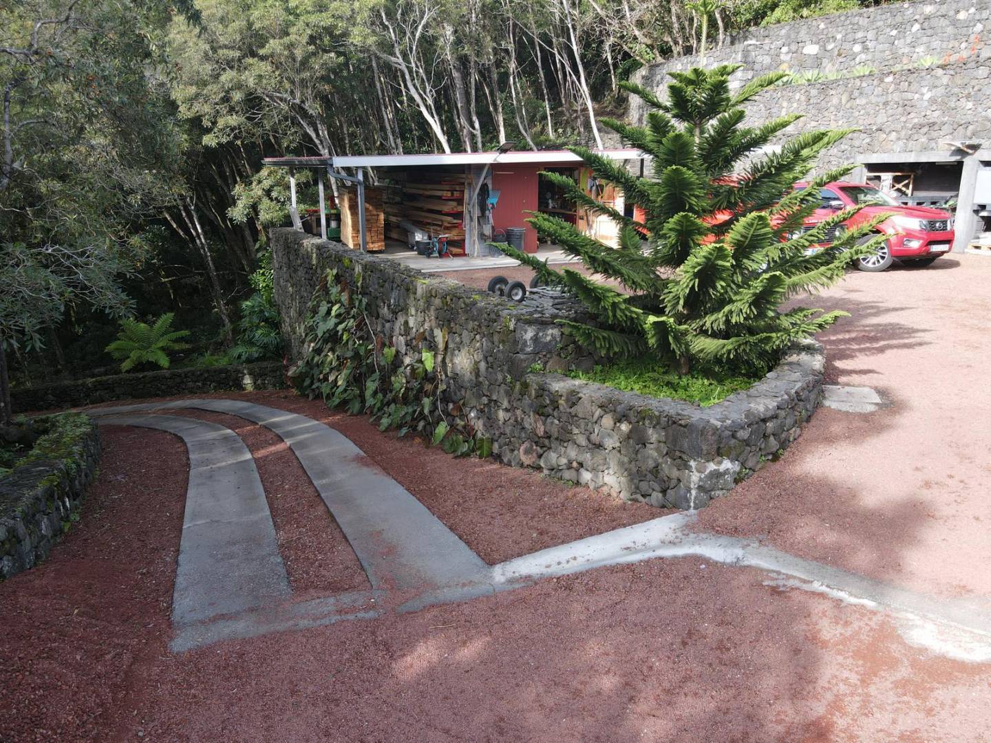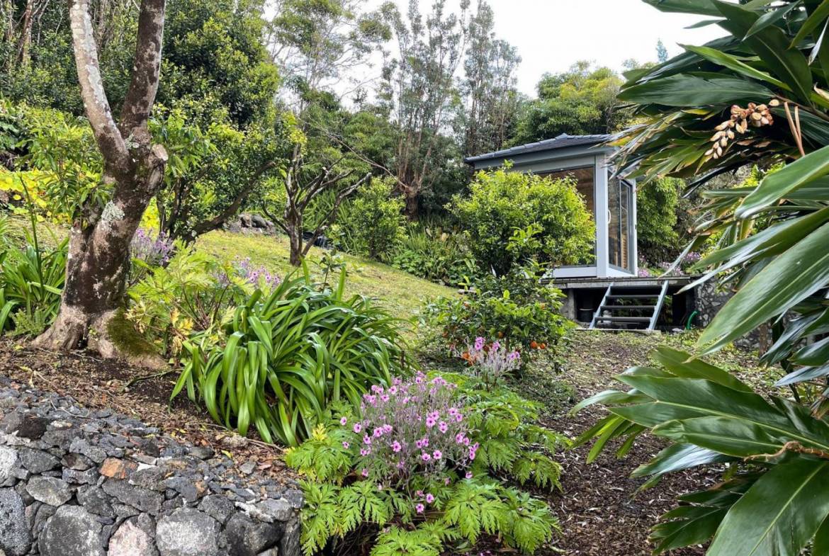 The exterior of the property is a masterclass in landscaping, utilizing the local volcanic “terra rossa” to create a striking contrast against the vibrant greenery.