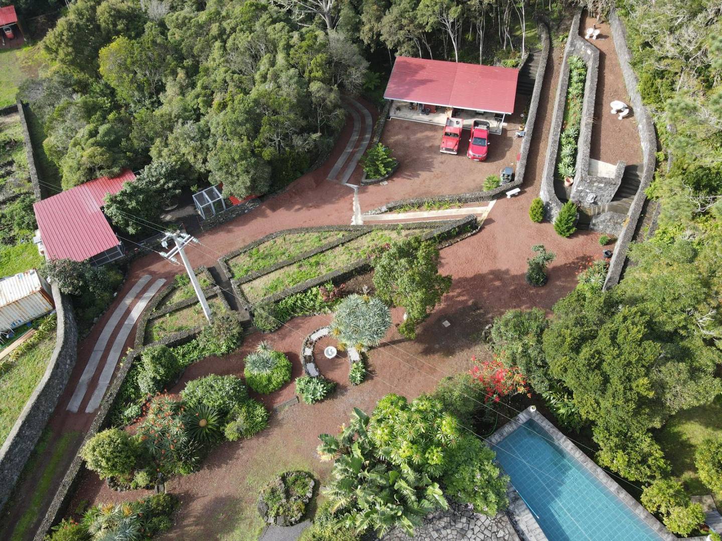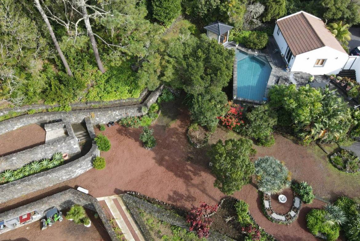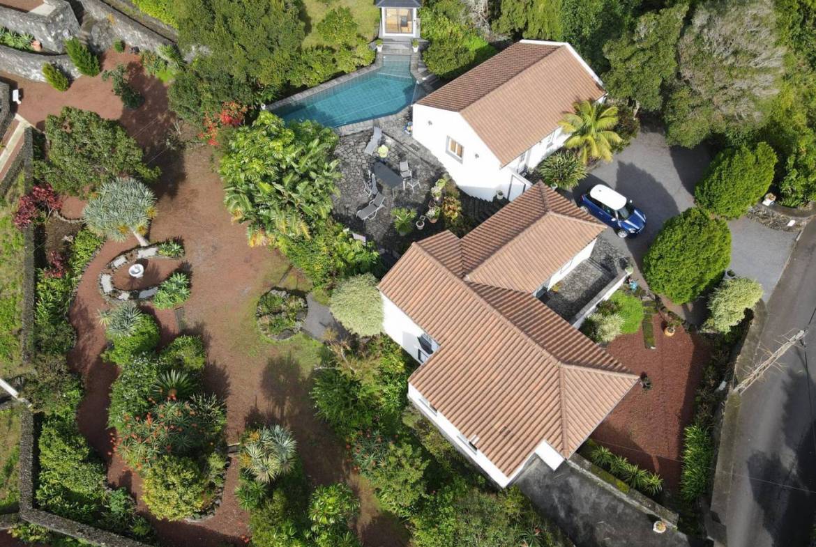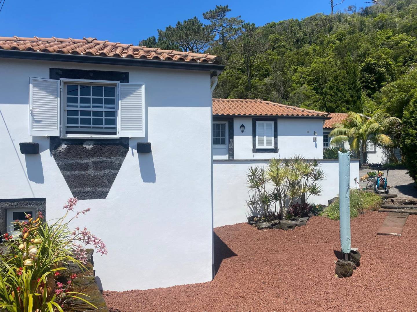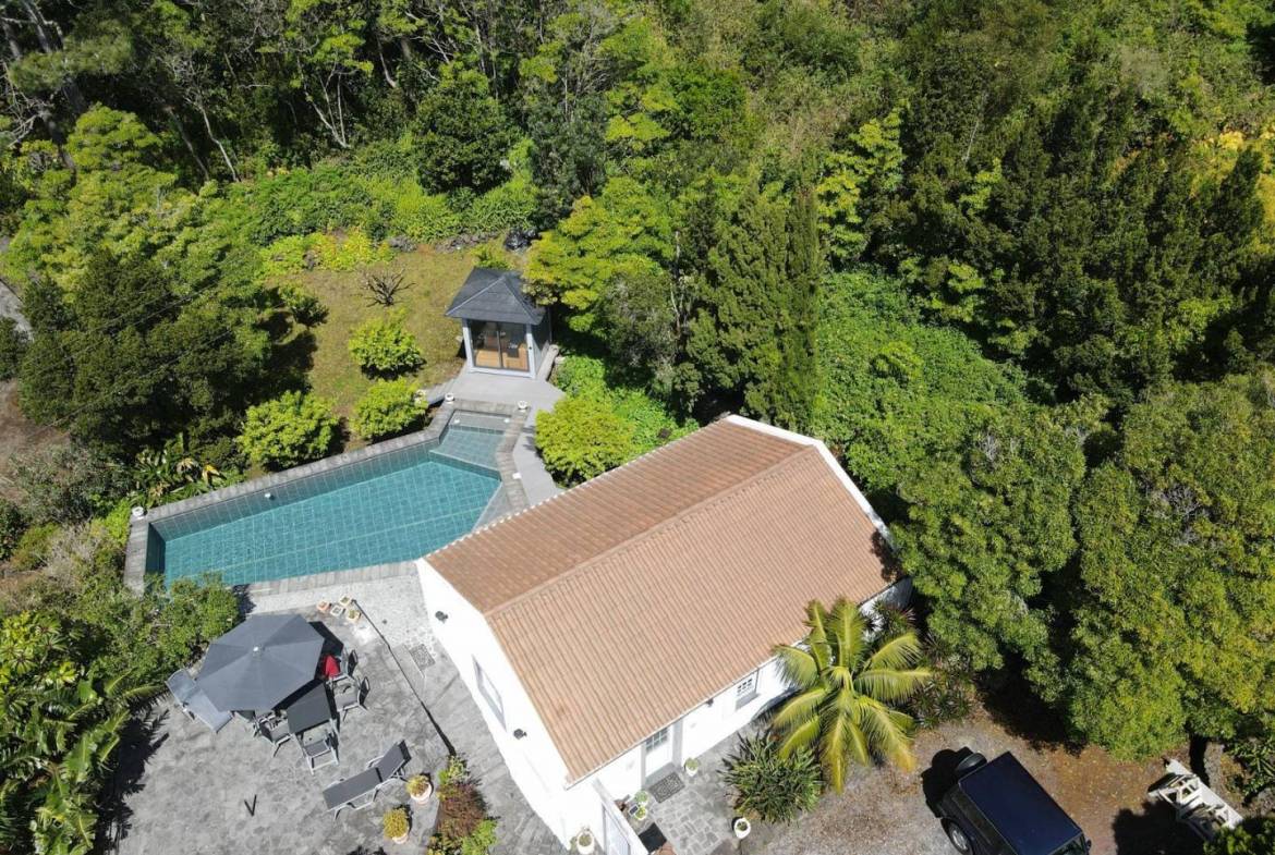 The exterior of the property is a masterclass in landscaping, utilizing the local volcanic “terra rossa” to create a striking contrast against the vibrant greenery.