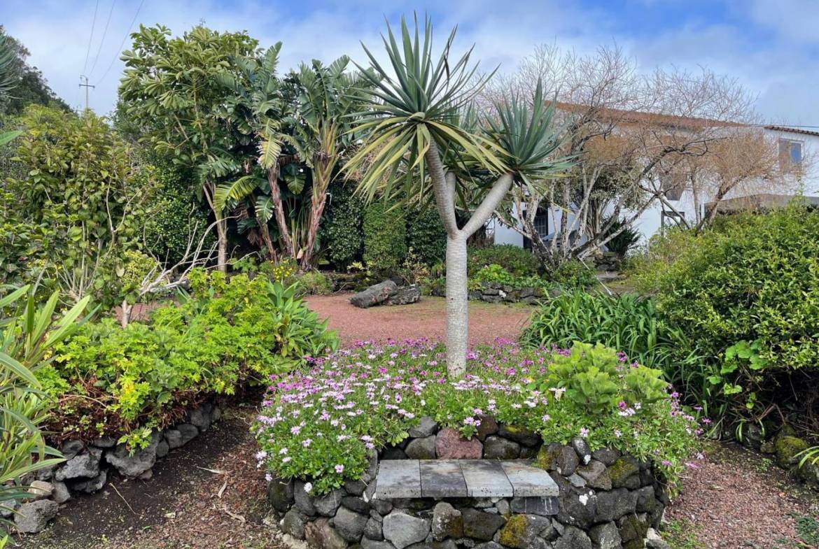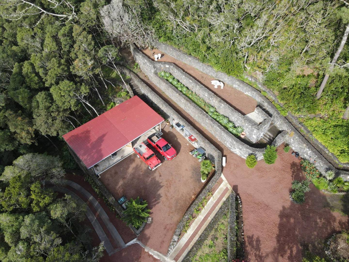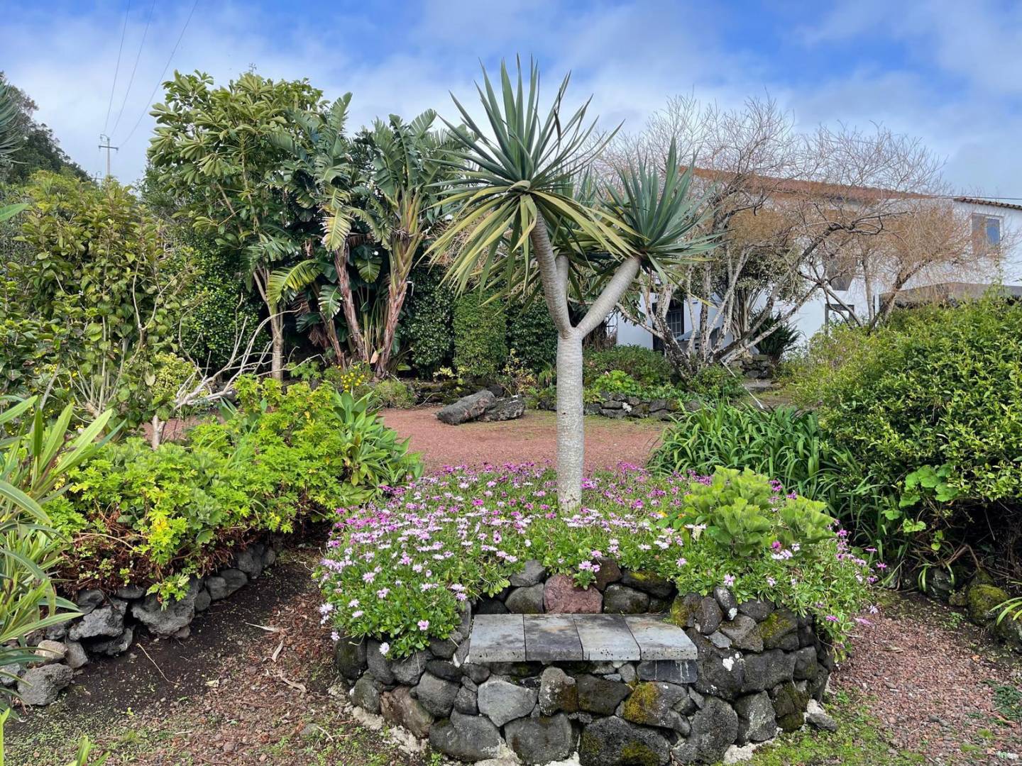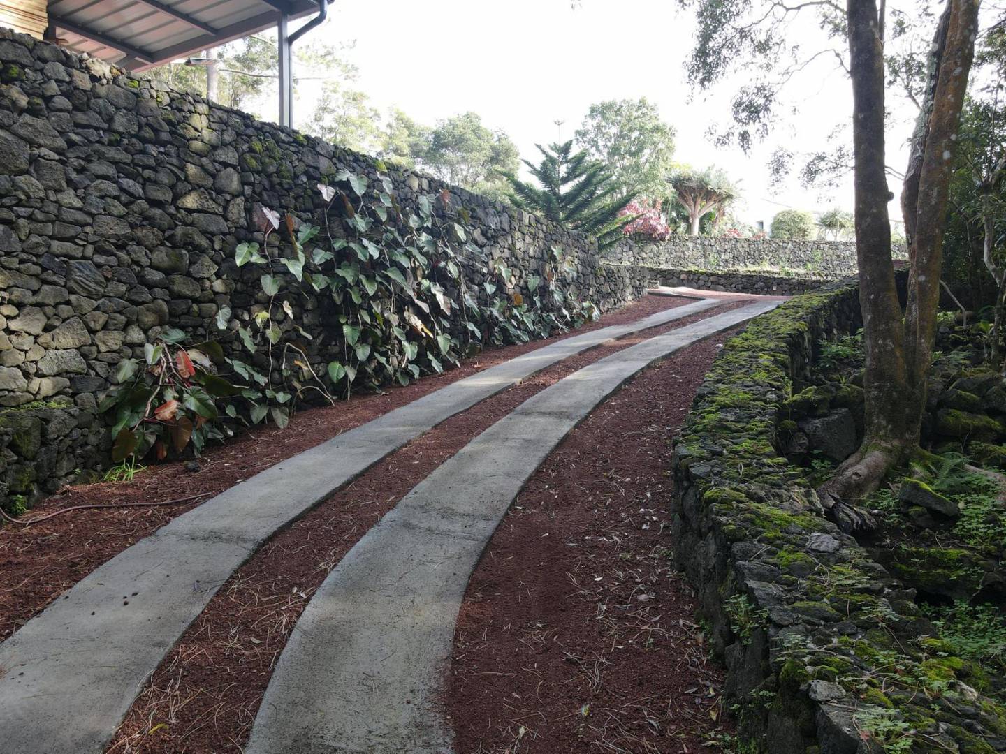 Architectural Gardens: Meticulously maintained stone-walled terraces and circular garden beds showcase exotic flora, including dragon trees and palms.