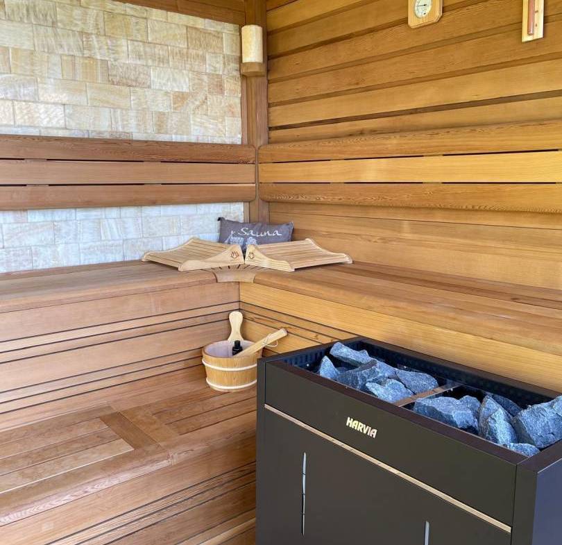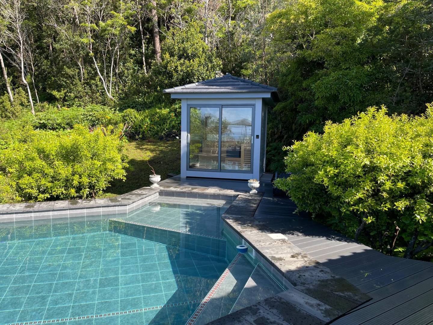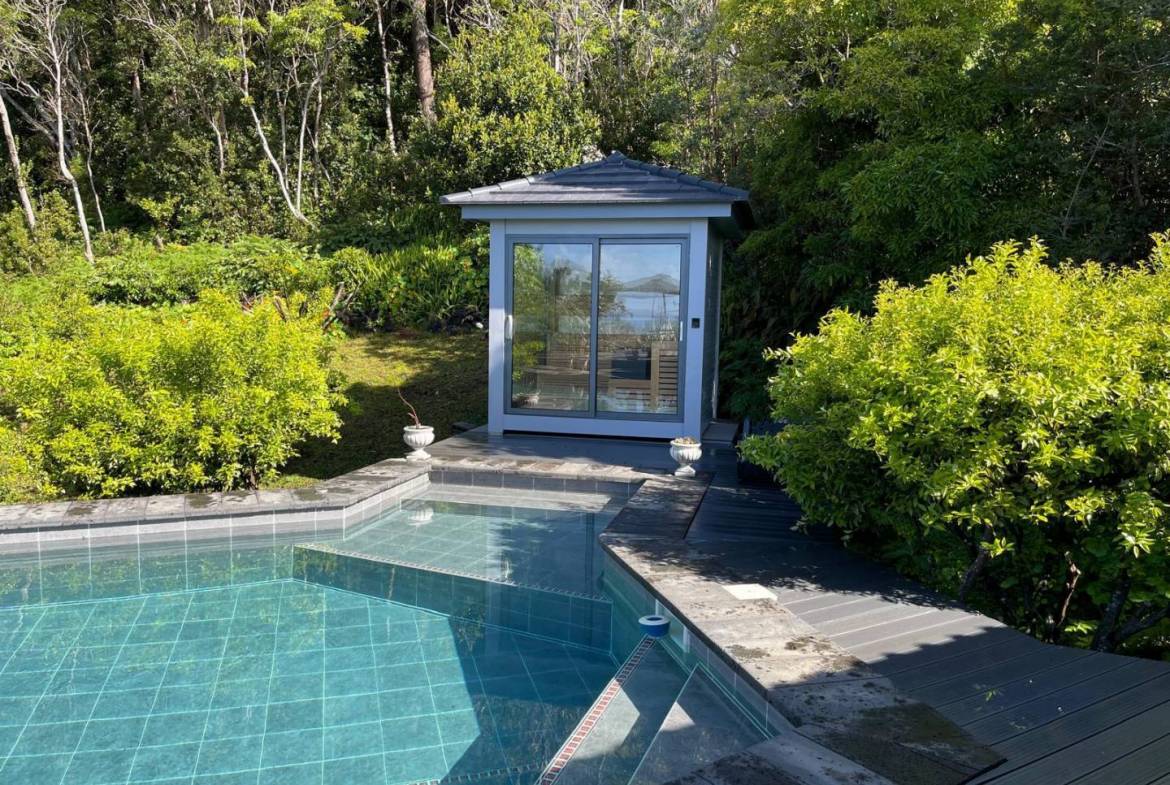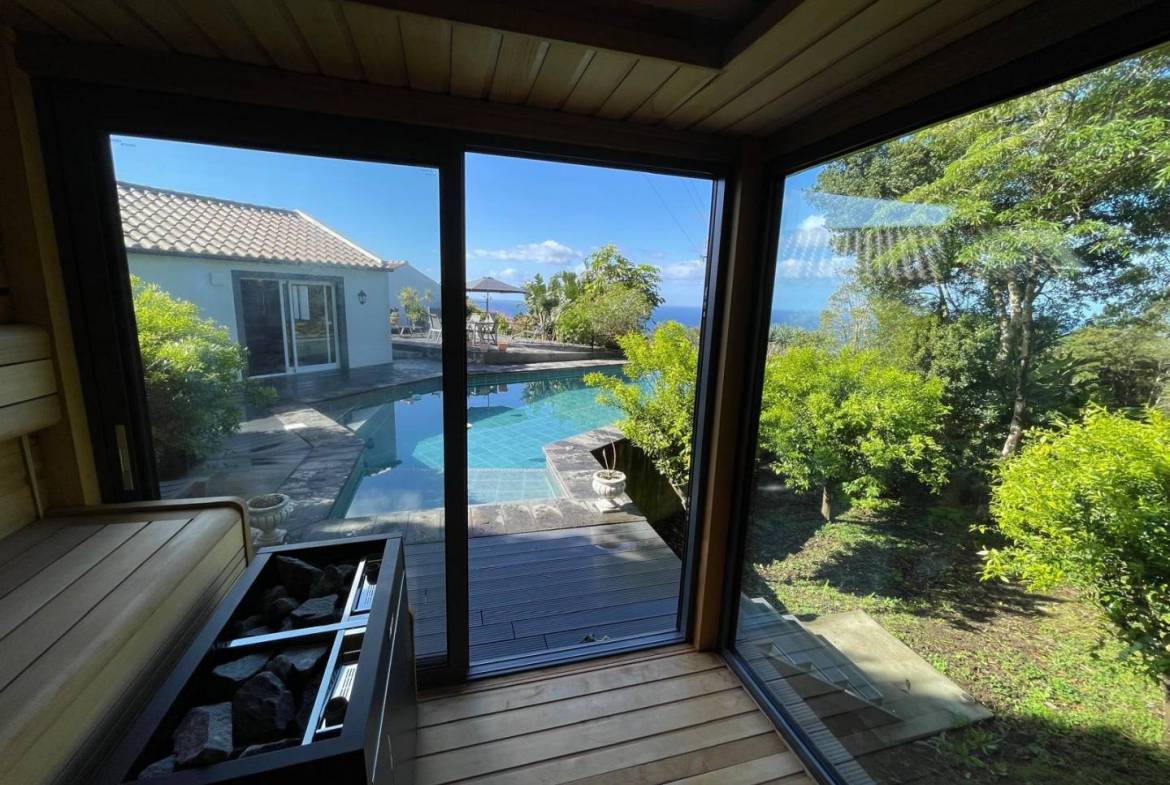 The Pool & Spa: A shimmering, turquoise-tiled pool serves as the centerpiece of the terrace. Adjacent to the water is a bespoke glass-fronted sauna, allowing guests to relax while overlooking the forest canopy.